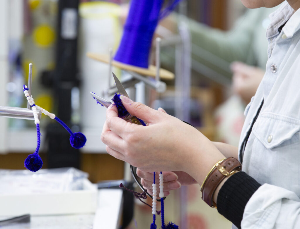 数珠の仕立てには、色やサイズが合わずに使えなかった端玉や、使いきれない端糸がどうしても生まれます 。これまでは日の目を見ることがなかったこれらの素材を、職人の「慈しむ心」とともにアップサイクルしました 。